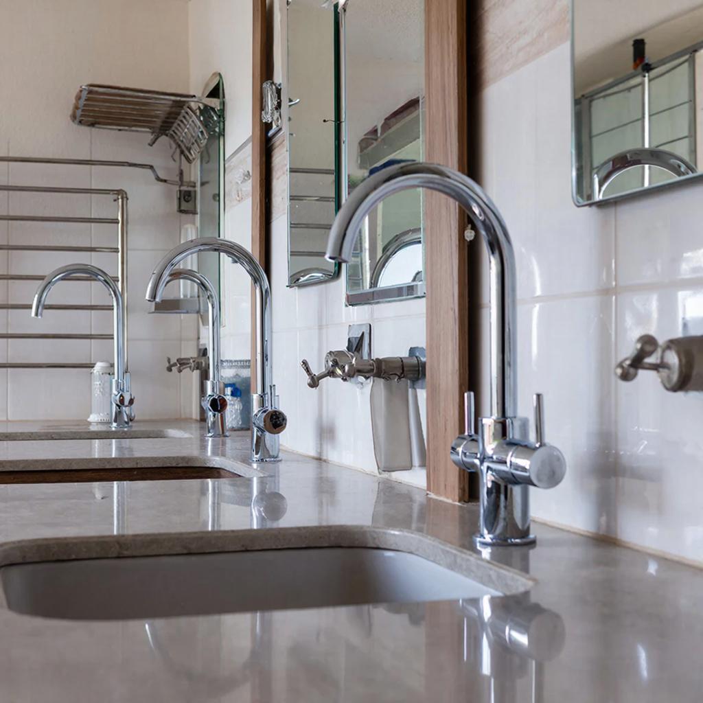 Унитазы с функцией биде популярны. Смесители для кухни и ванной. Хромированные, матовые. Фильтры для воды ставят многие. Убирают хлор и ржавчину. Раковины надстройные, встраиваемые. Материалы – керамика, стекло, металл.